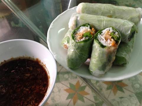 Bánh tráng thoa sơ nước cho hơi mềm, xếp xà lách, rau thơm các loại (đã rửa sạch vẩy ráo), 1 ít nguyên liệu đã xào ở bước 2 vào, cuộn lại.
