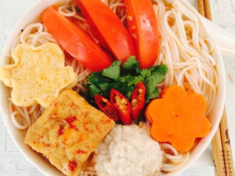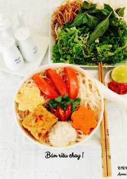 6. Xếp bún ra tô múc nước dùng cùng riêu đậu, cà chua, nấm, đậu chiên, trên cùng là ngò cắt nhuyễn, vậy là ta có tô bún riêu chay ngon