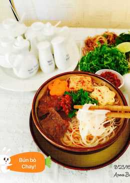 Trình bày và thưởng thức Trụng bún qua nước sôi sau đó cho vào tô. Múc nước lèo chan vào tô bún sau đó sắp thịt bò chay, đậu hũ và nấm lên trên mặt tô bún bò chay. Bày ra bàn cùng các loại rau thơm và rau sống và mời cả nhà cùng thưởng thức.