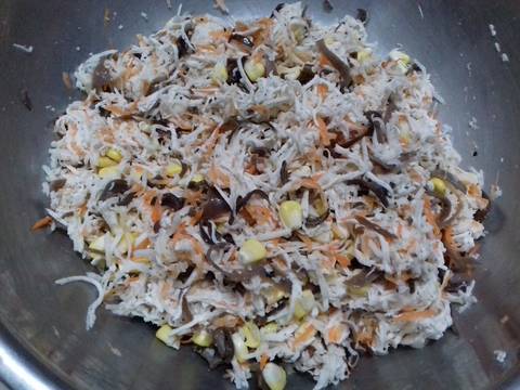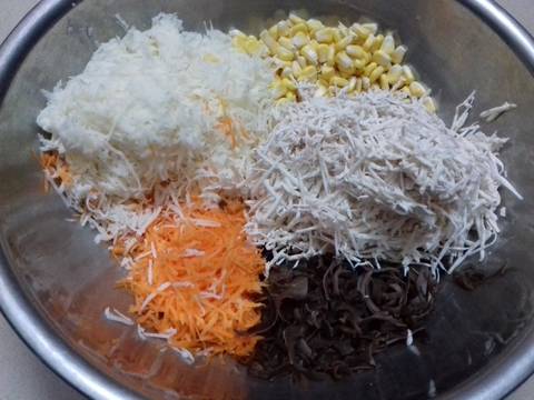 Củ sắn cà rốt bào nhỏ vắt ráo nước, khoai môn bào sợi cắt nhỏ, nấm mèo ngâm nở rửa sạch cắt nhỏ. Bắp tách hạt.