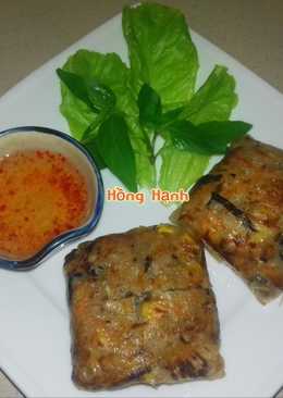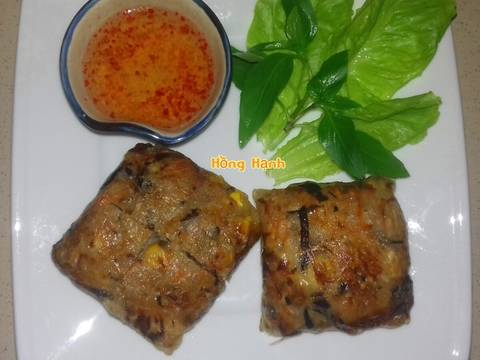 Sau đó trải vỏ bánh đa cuốn vuông hay cuốn tròn tuỳ thích và chiên vàng. Khi ăn dọn kèm nước mắm chay và rau sống.