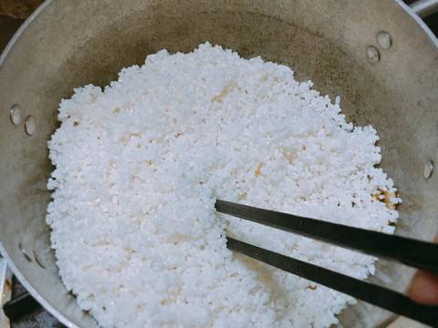 Tao đến khi nào thấy mùi thơm bay lên và gừng, sả, lá dứa đã xém vàng thì vớt hết xác ra, để dầu lại. Cho liu riu lửa, tiếp tục đổ hết số gạo đã ướp gia vị vào xào. Dùng đũa khuấy đều để gạo thấm hết phần dầu đã đc tao thơm lúc nãy. Đảo khoảng 2′ thì tắt bếp.