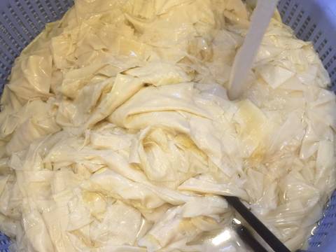Tàu hũ ky cắt nhỏ rữa dưới vòi nước nóng cho mềm và sạch