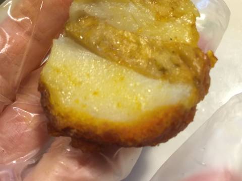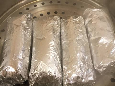 Đem giấy bạc và lá chuối cuốn quanh lấy miếng chả dính chặt với lớp bột.rồi đem hấp từ 30′ dến 45′,hấp xong cho vào tủ lạnh vài ba tiếng hoặc để tủ lạnh
