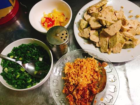 2. Xắt nhuyễn hành borô, bắt chảo dầu cho nóng bỏ hành borô vào phi vàng vớt hành ra, còn dầu trong chảo bỏ nấm đông cô vào xào cho săn lại tiếp cho nấm rơm vào hết luôn, xào sơ 2 loại nấm xong cho hết vào nước dùng