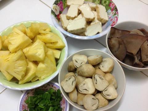 2. Nấm mèo ngâm nở, cắt bỏ gốc dơ, xắt lại làm 2,3 hoặc xắt sợi dầy tuỳ thích Nấm rơm gọt bỏ phần chân nấm dơ, ngâm nước muối loãng và chút bột năng cho nấm trắng, rửa lại chẻ đôi. Tàu hủ xắt miếng mỏng vừa Cho khóm vào chảo đem rim trước cho khóm thấm. Rim đến khi cạn nước, khô dẻo là được