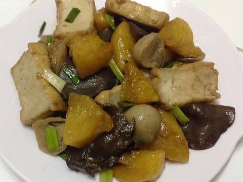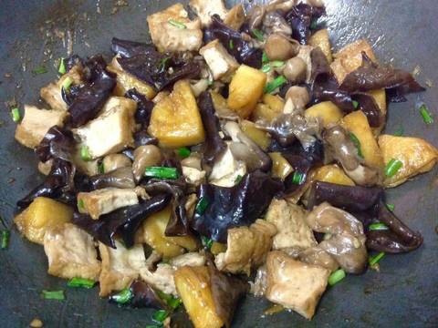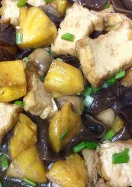 3. Chảo dầu cho tỏi hoặc boaro phi thơm, cho nấm vào xào trước rồi cho nấm mèo, khóm, tàu hủ vào. Cho vào 1 cup nước, 1/4 cup nước tương, 1/2 tbsp bột nêm, 1 tbsp đường rim đến khi cạn nước cho hành vào, nhắc xuống