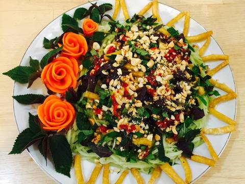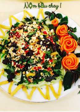 4. Rau thơm rửa sạch, xắt nhỏ. Trộn bầu với rau thơm, đậu hũ. Cho xì dầu,đường, nước cốt chay trộn nộm, thật đều. Để khoảng năm phút cho thấm gia vị, sau đó chắc nước gỏi ra cho ráo nước. Cho ra đĩa, trang trí với vài lát ớt và rau thơm, rắc đậu phộng lên mặt. Ăn kèm bánh phồng tôm chay.