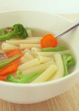 Đảo nhanh bông cải xanh, cà rốt, đậu que, nấm rơm qua chút xíu dầu ăn và muối rồi trút nước dùng vào đun. Khi thấy bông cải, cà rốt, đậu que, nấm gần vừa ăn thì trút nui vào đun cùng. Đun thêm 1 chút rồi dùng.