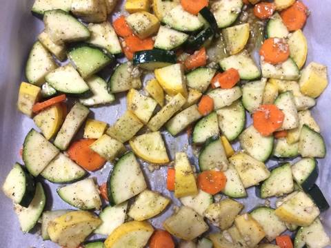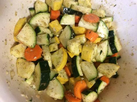Bí và cà rốt rửa sạch, cắt miếng nhỏ. Cho vào tô to trộn chung với tỏi, tiêu, muối, dầu ô liu.