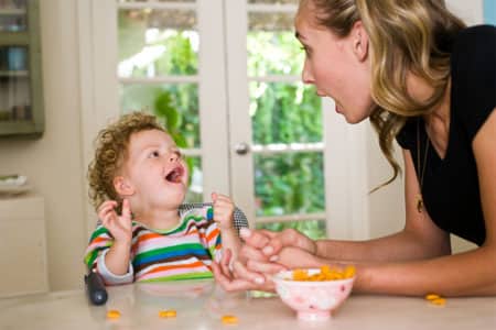– Khi trẻ bắt đầu tập ăn thức ăn dạng hạt hoặc dạng miếng, bạn luôn bên cạnh bé để động viên con kịp thời làm cho trẻ phấn khởi, đồng thời bạn có thể xử lý kịp thời nếu trẻ nghẹn hoặc sặc.